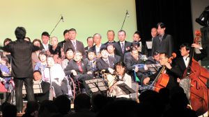 今回、ラストを飾ったのは、初登場となるマラソン教室のメンバー達。ミュージックパーティーでマラソン?と、企画段階では皆頭の中が?となっていましたが……。お揃いのマラソンウェアにサンタ帽子をかぶって颯爽と入場。お米2キロのプレゼントを両手に持って、約150人の当選者の席までヨーイ・ドン! お米マラソンの仲間達がさわやかに、ミュージックパーティーの幕を閉じました。