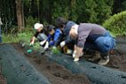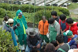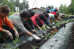 トマト、きゅうり、なす、ピーマン、ブロッコリー、かぼちゃなどなど苗が運ばれ、植えるだけに準備されている畑へ。「まだ、芽が出たばかりの弱々しい苗です。やさしくやさしく扱ってくださいね。」 とのジョニーさんの説明に頷きながら、一つ一つを丁寧にやさしく1時間ほどかけて植えきりました。