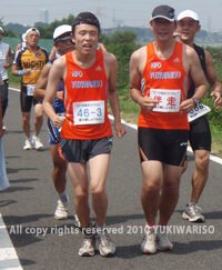 小林大祐さんと小間大輔さんも炎天下、猛暑の中で奮闘し、沿道の人々や参加中の選手に温かい声援をいただきながら3時間11分16秒で無事ゴール。結果は49チーム中43位でした。